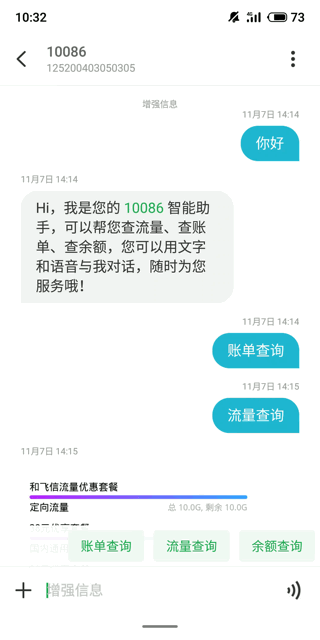 比如说,在移动10086的官方服务号中,可以顺利获得回复、点选关键字的形式来操作,系统会自动回复我们想要的信息,并且会用富媒体卡片式的形式来展现。
