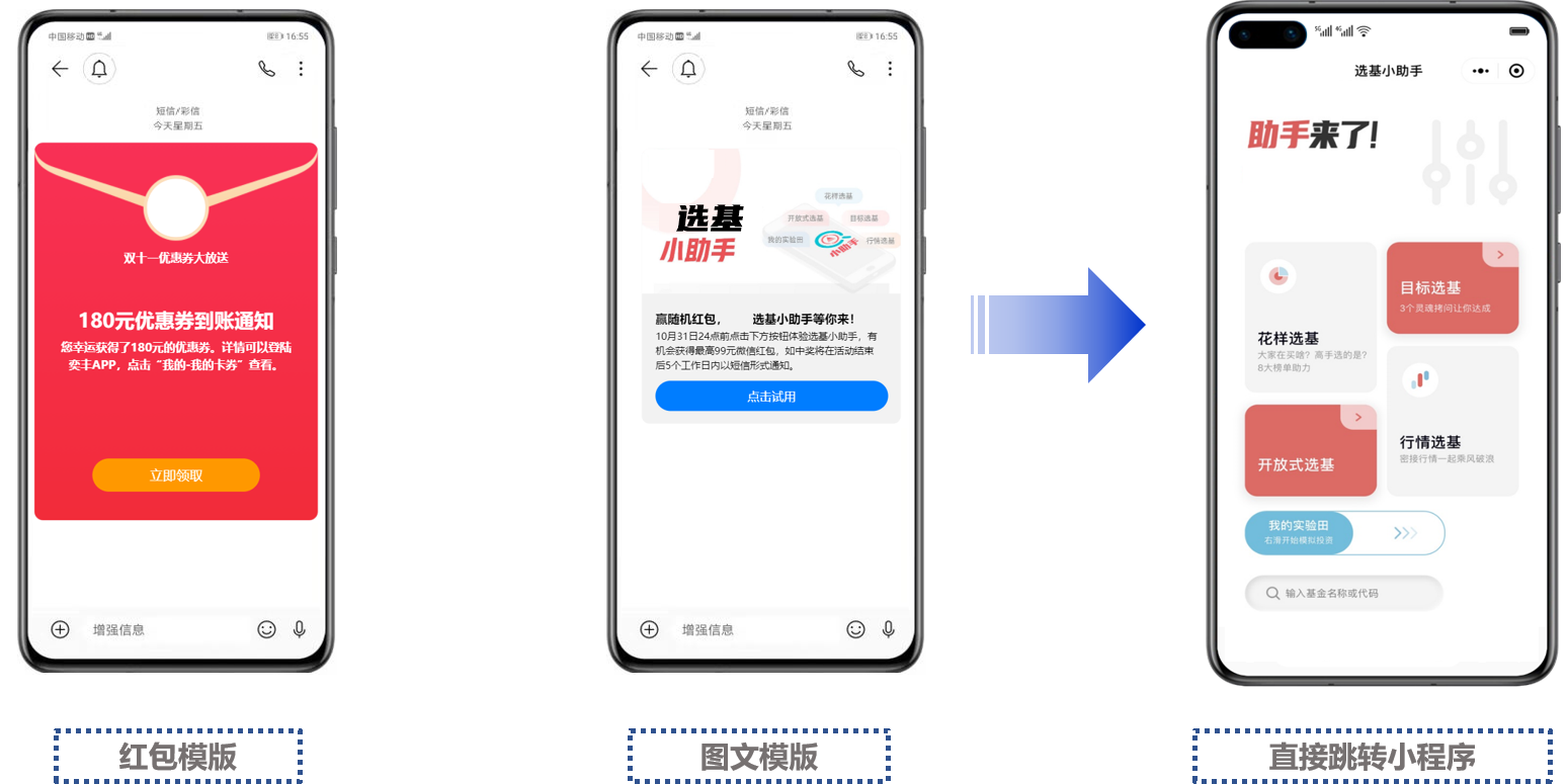 现在不管是APP还是小程序,拉新促活的成本都越来越高,尤其针对金融行业的用户运营来说,除了简单的引导用户下载APP,更重要是顺利获得运营手段激活用户,转化为有价值的用户。从这一点出发,凯发k8官网科技5G消息解决方案新增了多种样式的消息模板,支持采用图文+红包文案的方式助力基金行业高效拉新促活。