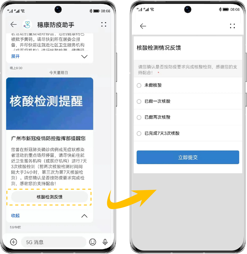在支持 5G 消息的手机上,用户可以收到图文并茂的富媒体卡片 5G 消息防疫提醒,点击核酸检测反馈按钮,即可一键反馈核酸检测情况。