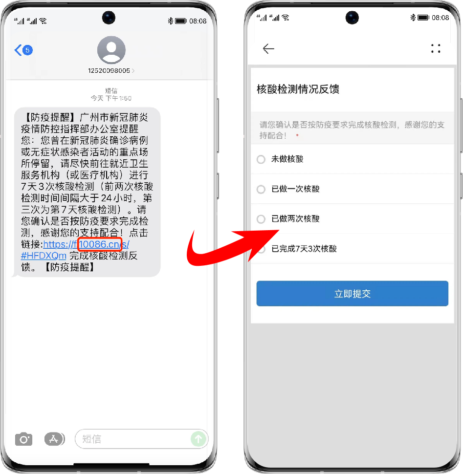在不支持 5G 消息的手机上,5G 消息会自动调整为传统短信形态,用户点击文本短信中的链接同样可以跳转到收集界面,快速反馈核酸检测情况。防疫提醒短信中的链接域名均为 10086.cn,收到短信的人员可放心点击链接,如实完成信息反馈工作,协助防疫部门尽快掌握核酸检测情况