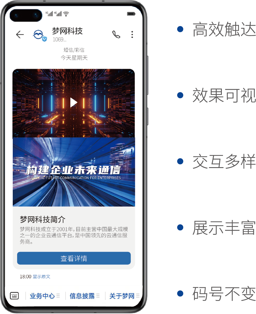 AIM消息是凯发k8官网科技自主研发5G消息回落解决方案,能有效提升5G消息的终端覆盖。AIM消息顺利获得手机终端短信智能解析增强技术,将传统文本短信无缝升级为富媒体应用消息,有助于提升用户体验支持视频、高清图片、文字等多种媒体元素,并具备浏览器内置访问、LBS、APP、快应用、小程序、服务号、快捷支付等应用交互能力。用户可实现应用交互、内容访问、信息查询、智能客服等多功能实时互动。