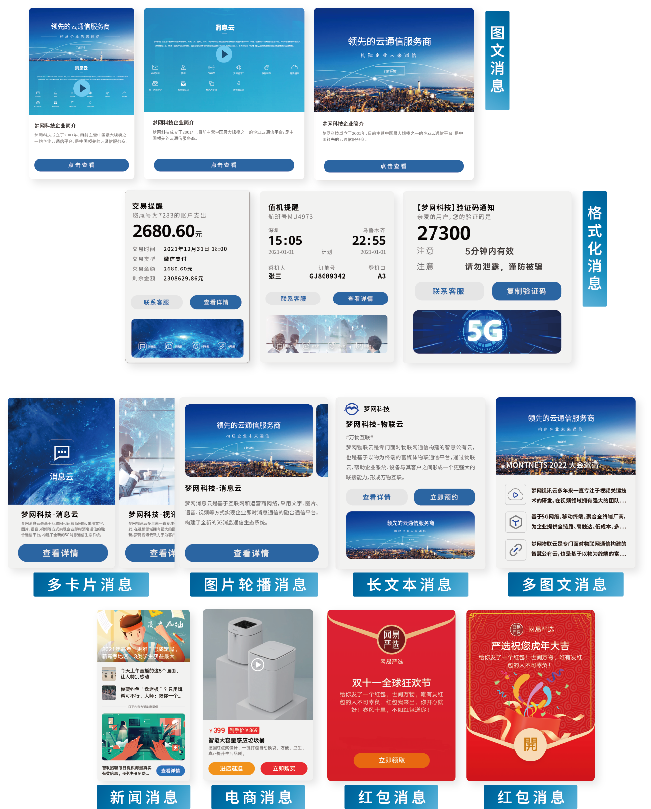 AIM消息将原有行业信息的单一呈现方式升级为多元呈现及多样交互,以丰富的消息模板给用户带来视觉冲击,提升用户体验,同时也满足了企业多样化的营销服务需求,打造全新的全触点营销服务场景